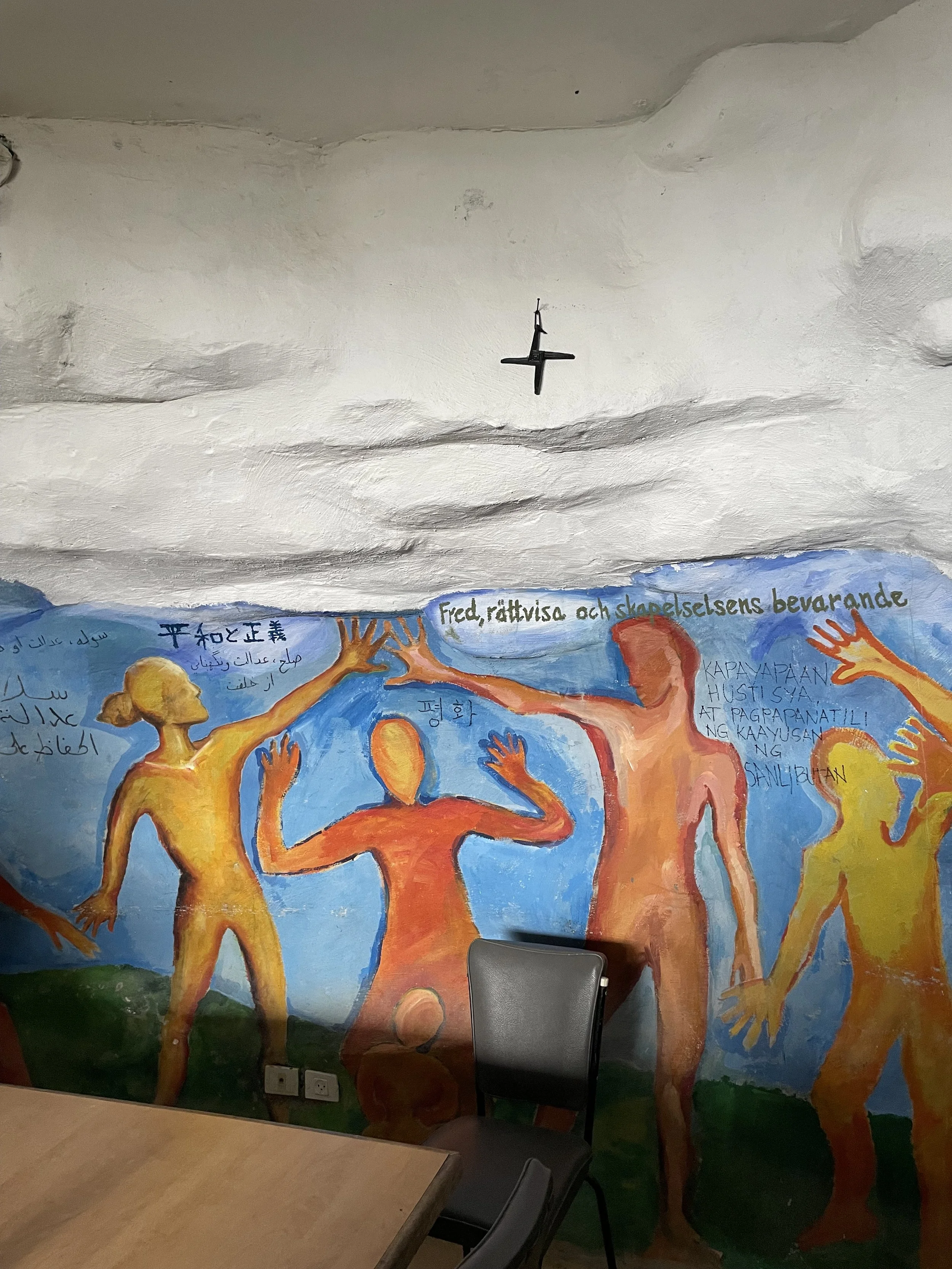 The walls of a cave classroom at the Tent of Nations is adorned with a peace mural made by children, showing their shadows and wishes for peace.
