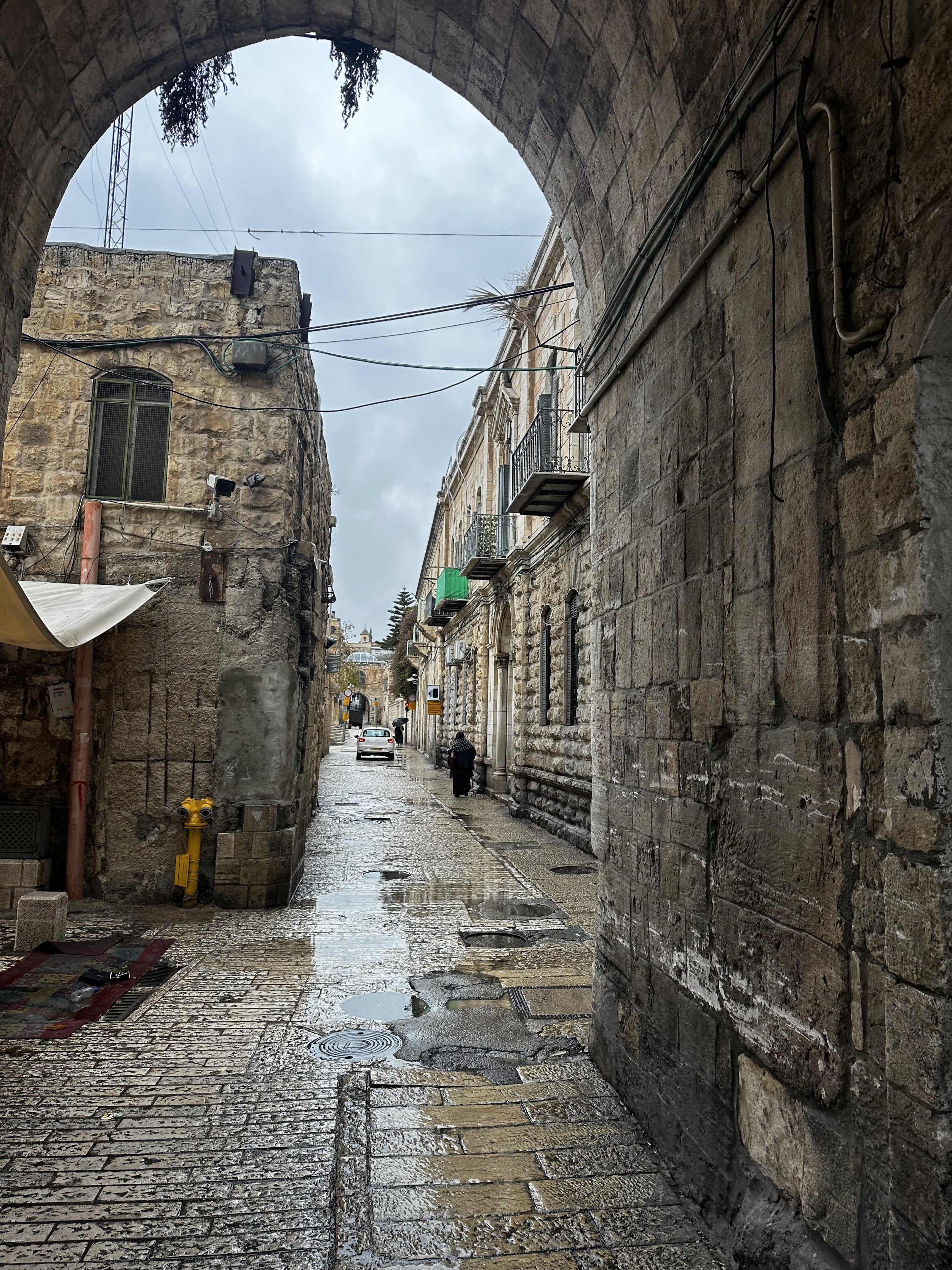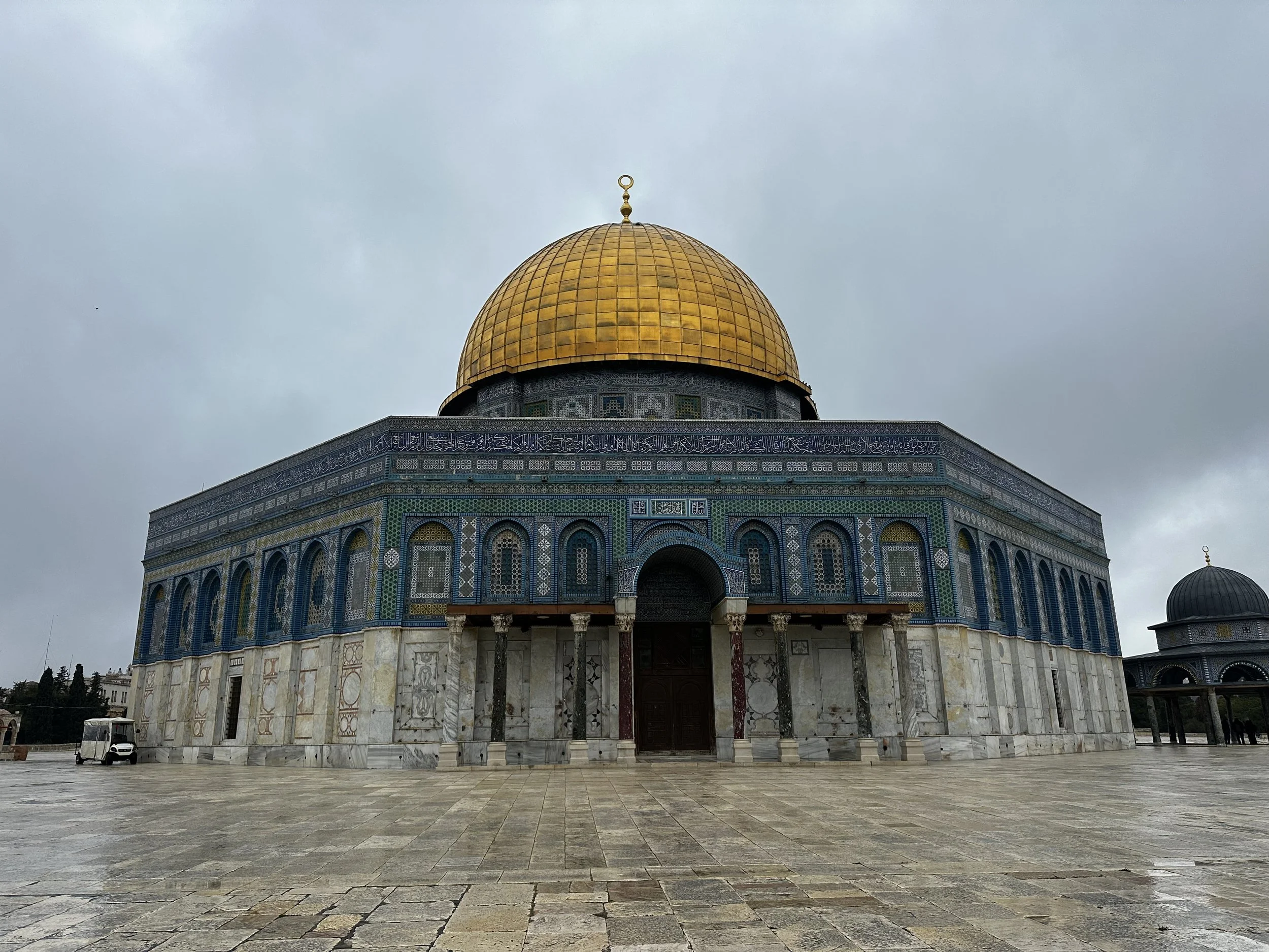 Our guide at Al Aqsa Mosque was one of the complex’s employees. (I’ll call him Aaron.) Aaron relayed to us the innumerable troubles the site has had. For example, one of the buildings on the complex had its windows shot out by Israeli soldiers. Despite having the necessary funds to do the repairs, the employees have not been granted permission by the government to begin. This meant that the recent heavy rains were able to inundate the inside of the building and completely soak the newly installed carpets. What could have been a standard replacement of a few windows has now turned into an extensive repair and restoration project thanks to the intentional and weaponized incompetence of the Israeli government.